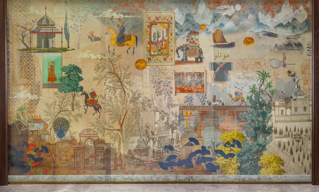 Minyatür sanatının zarafetiyle resmedilen sahneler, at sırtındaki tüccarları, denizleri aşan gemileri, sarayların ihtişamını ve doğanın bereketini tek bir tuvalde bir araya getiriyor. Eser, Doğu'nun zarafetinin Batı'nın merakıyla buluştuğu, Doğu ile Batı arasında örülmüş bir köprüyü gözler önüne seriyor. Her motif, insanlığın kolektif hafızasını şekillendiren karşılaşmaları, alışverişleri ve yolculukları anlatıyor. İpek Yolu burada bir rotadan çok daha fazlası haline geliyor; zaman ve kültürü iç içe geçiren şiirsel bir anlatıya dönüşüyor.